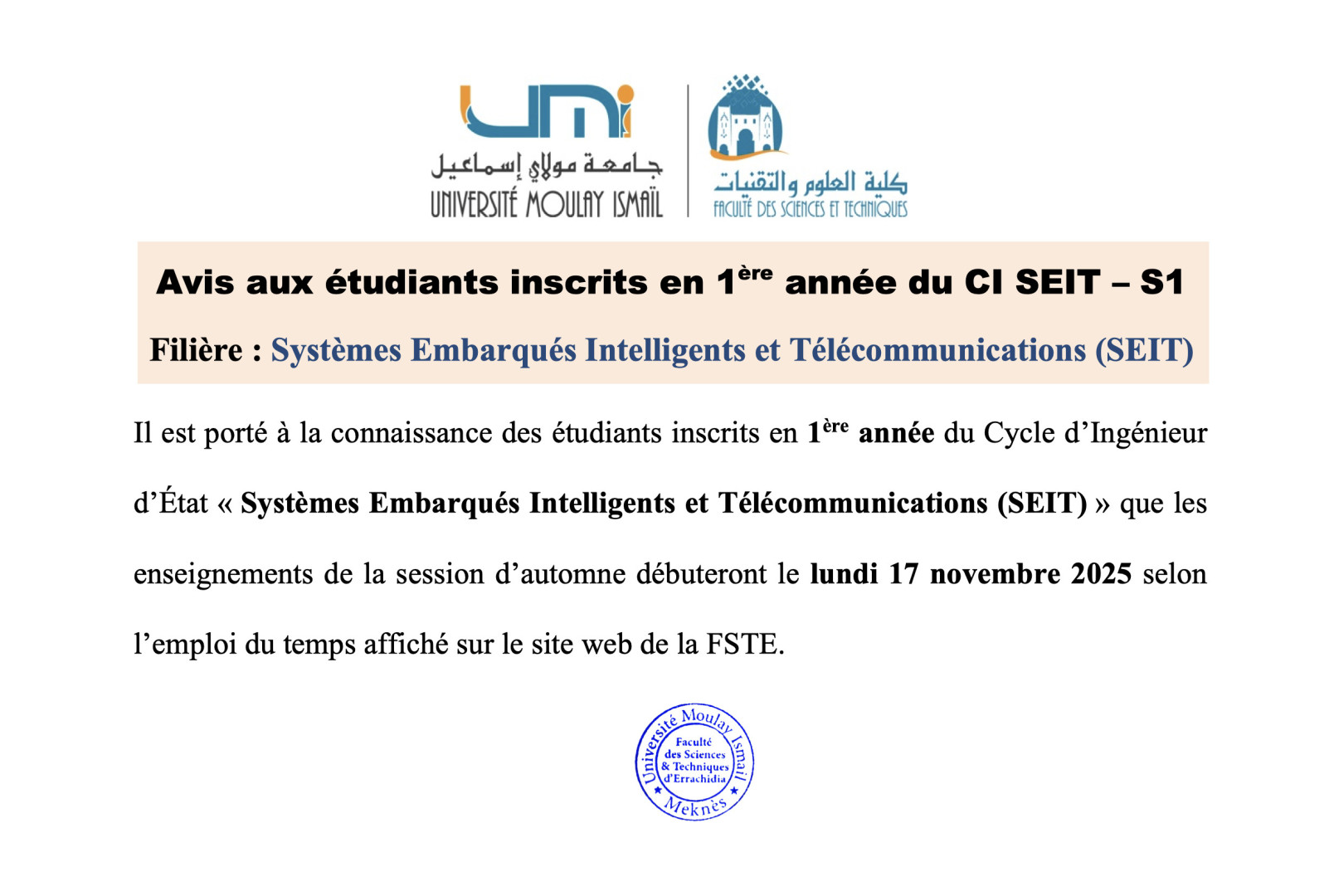 Avis aux étudiants inscrits en 1 ère année du CI SEIT – S1