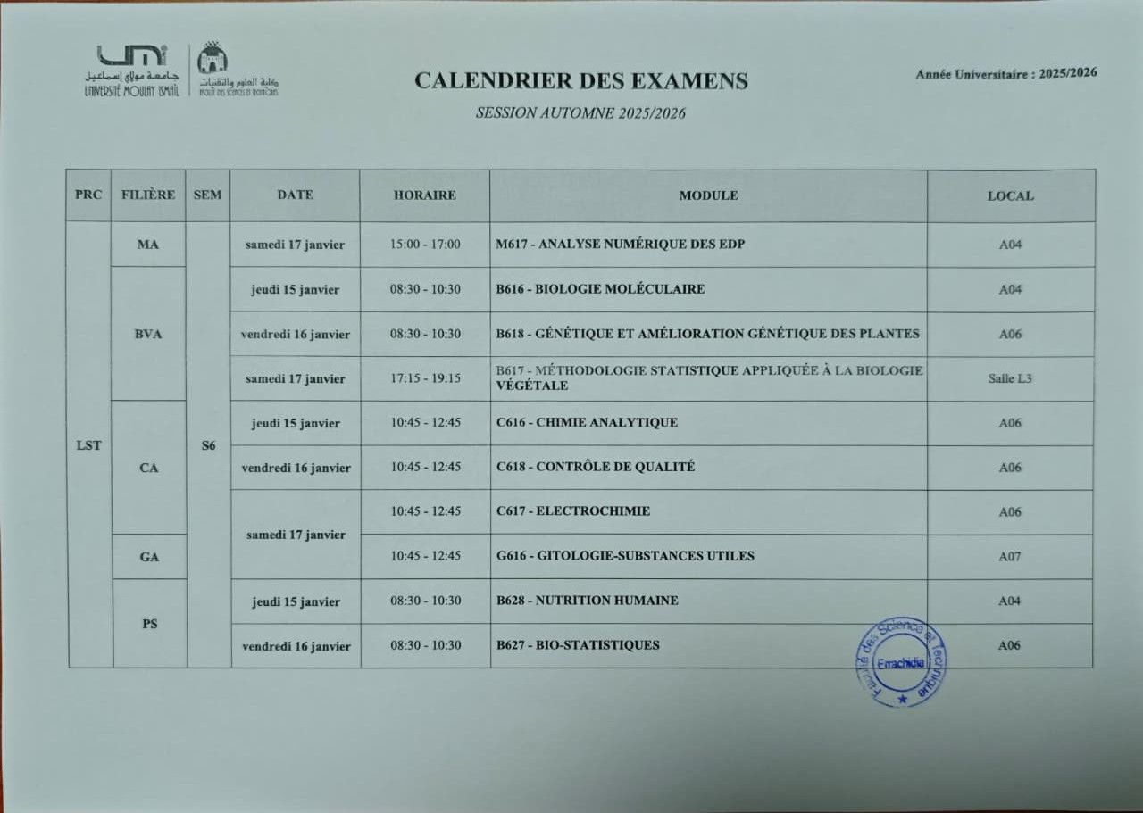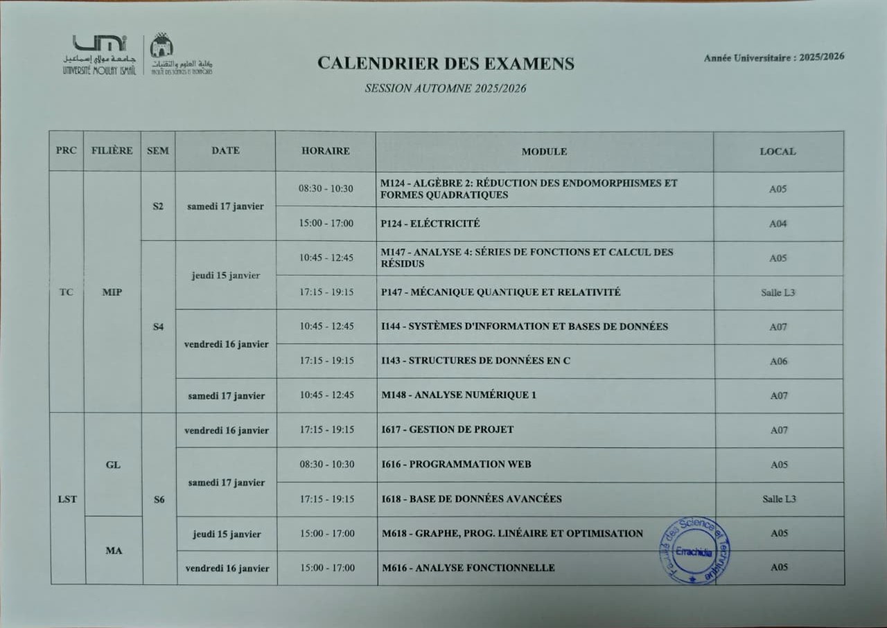 (RECTIFIÉ) Calendrier des Examens – MONE Session d’Automne 2025-2026