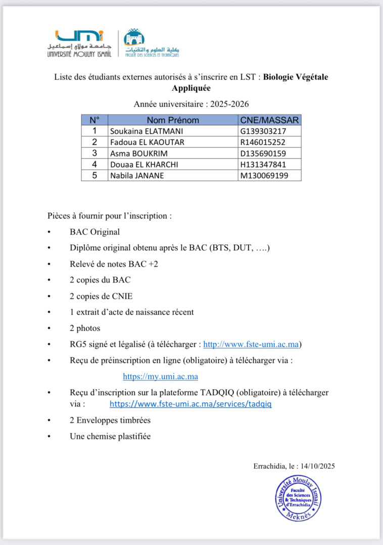 Liste des étudiants externes autorisés à s’inscrire en LST : Biologie Végétale Appliquée
