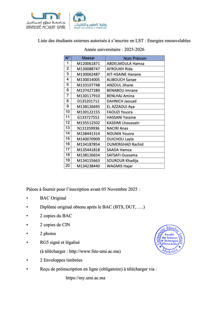 Liste des étudiants externes autorisés à s’inscrire en LST : Energies renouvelables Année universitaire : 2025-2026